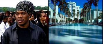 I was a bit of a fish out of water since I was wearing jeans, short-sleeve shirt, and sneakers, while rockin some oh so sexy 3-day stubble. As I was walking around the place taking in a shit load of chic, who do I see standing by the back of the pool. None other than Sway, the black guy from MTV News. I get excited! Because, well, I hate that guy he really annoys me. Now is my chance to go annoy him.